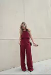Conjunto em viscose texturizada, com leve brilho, a calça acompanha dois cintos fixos e fivelas meia lua, Top degagê com reguladores nas alças.